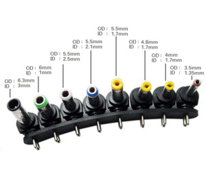 | DC connector? | ? 6.5*4.3mm, 6.3*3.0mm, 5.5*2.5mm, 5.5*2.1mm, 5.5*1.7mm, 4.8*1.7mm, 4.0*1.7mm, 3.5*1.35mm, compatible with laptop of Acer,Compaq,Dell,HP,IBM, Samsung, Sony,Toshiba and many other brand laptops. |